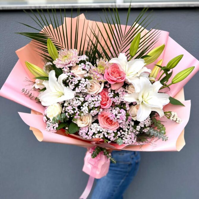 buketimiz çok büyük boyutta kişiye özel tasarım yapılarak ithal çiçekler kullanılarak içersinde pembe gül beyaz lilyum ve zengin garnitürlerden hazırlanmıştır.Sezonun en şık isteme çiçeği olarak ve özel gün çiçeüi olarak tercih edilenlerden olmuştur.