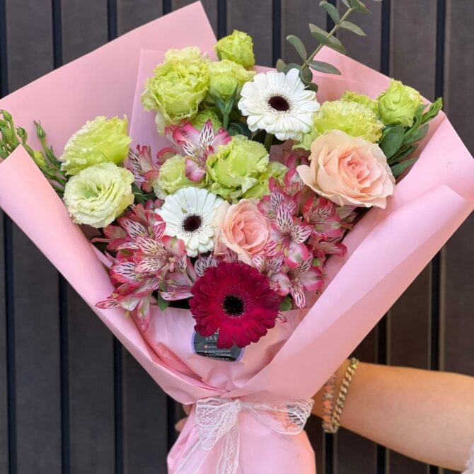 BUKETİMİZİN İÇERİSİNDE LİSYANTUS GÜL GERBERA VE ZENGİN GARNİTÜRLERDEN TASARLANMIŞTIR.ÇOK HOŞ VE ZARİF GÖRÜNÜMESAHİPTİR.